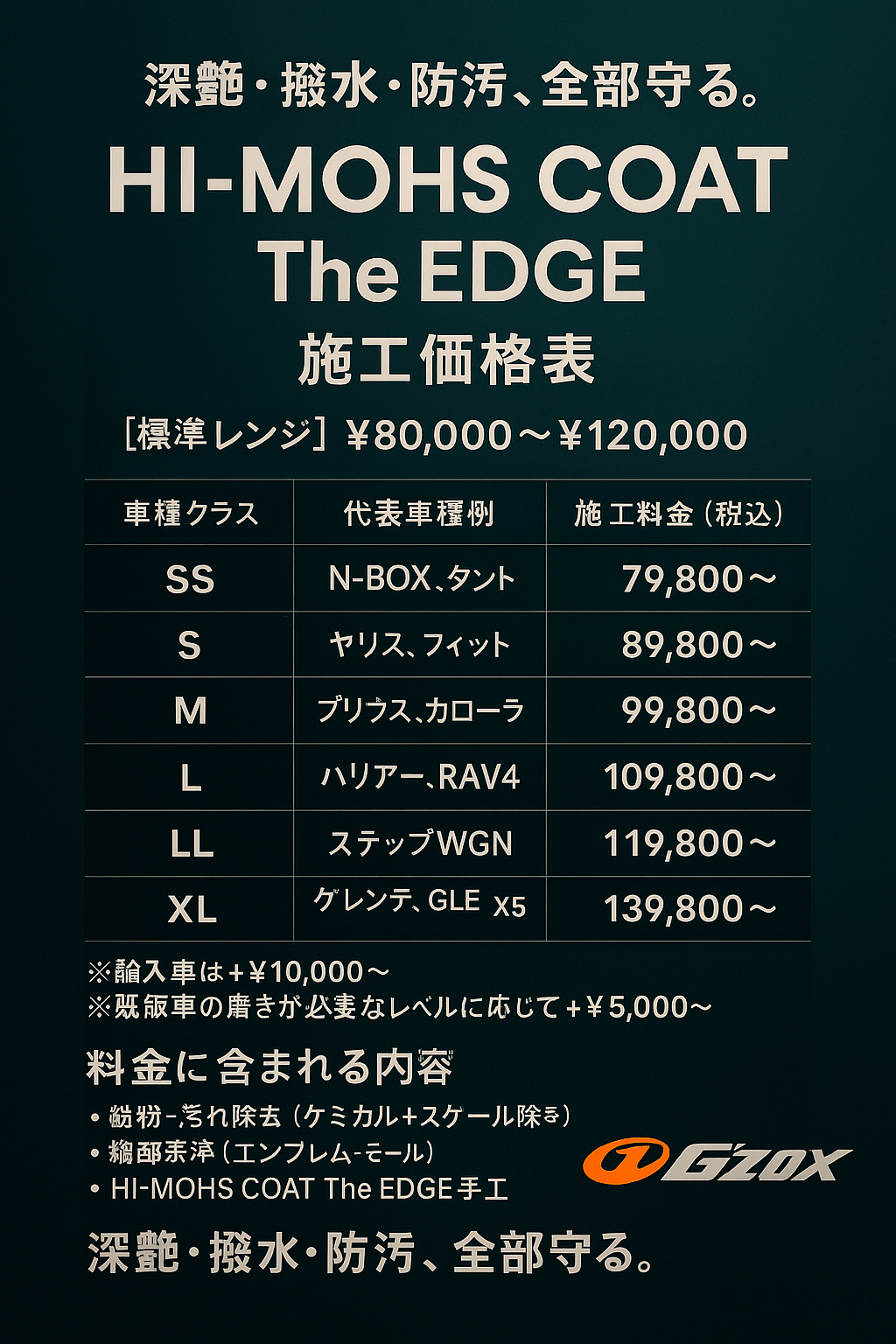モース硬度レベル8の超高硬度被膜が生み出す気高いほどの光沢を、G'ZOX史上最高の撥水・耐久性能で守り抜く、2層構造のガラス系ボディコーティング。先鋭の撥水 新・世界品質「ハイモース コート ジ・エッジ」